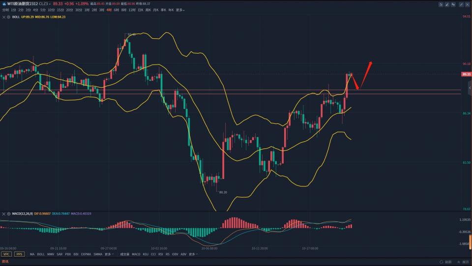 从日线上来看,布林带走平,价格成功突破中轨附近阻力,稳稳的站在中轨上方,多头趋势已经很明朗,下一个目标就是9月底的高点92美元附近,日内需要做的就是等待行情回调布局多单即可。4小时,布林带开口,价格回踩中轨附近企稳后延续上涨走势,短线价格走势还是以震荡偏多为主,日内关注下方87.8-88一线支撑,也就是周三价格回调的阻力位置,回踩企稳后再度进场。