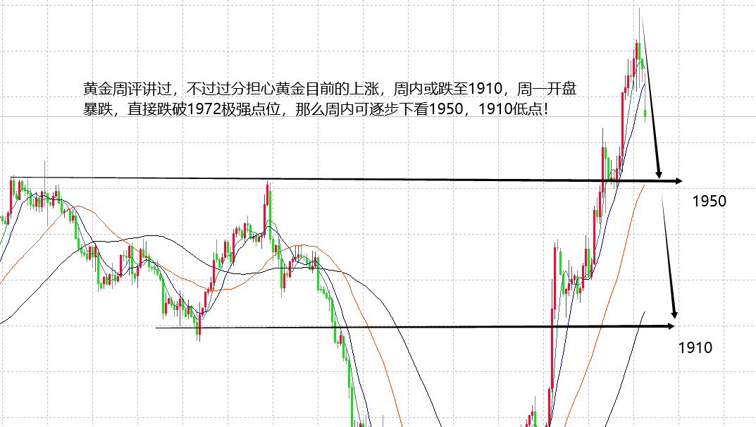 平庸的人,只是眷恋近处的风景,贪恋凡俗的奢华,最终忘了赶路,舒适并安逸着,且自鸣得意,终一无所成;优秀的人,独行在沉默的时光中,忍受着清贫与寂寞,从不哀怨,从不言苦,踏着血汗的阶梯,攀上了他人企盼的高度。曾经的苦与累,不是为别人受得,那是你蛰伏的背景,回眸的闪光。人生没有绝对的公平,却又是相对公平的,在一个天平上,你得到的越多,也必须比别人承受得更多。上周贵金属,能源产品的多头在延续,黄金出现大涨至1997高点,虽然山海看到了1980高点,但最后尾盘的上涨力度还是让有点吃惊,不过好在山海交易的原则是控制风险首当其冲,所以,上周一直提醒大家在1980之上不要追多,从尾盘1997的大跌就可以看到,追高是多么的难受。周评讲过:别过分担忧黄金现在的大涨,下周或跌至1910!从早盘开始暴跌到现在1965,已经基本确定本周不会有新高,那么,接下来贯彻这个思路,看空黄金至1950,1910目标点。