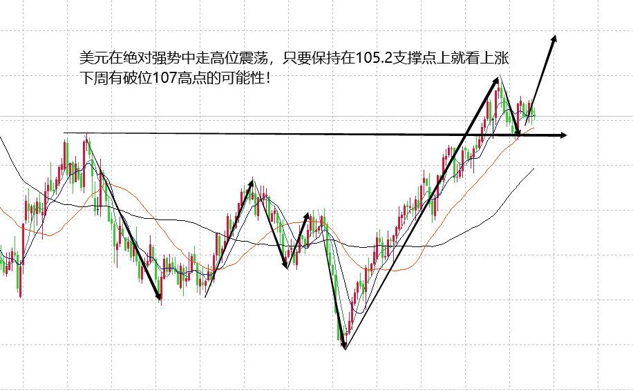 美元本周继续看涨是刻在分析中的重要观点,周评也讲过关于地缘局势,关于美联储鲍威尔讲话的信息,关于美联储是否加息等问题,大家有兴趣可以翻看一下之前详细分析。本周美元只要保持在105.2支撑之上就是对的强势,至于什么时候上涨,能上涨到多少,我们慢慢看,先看上方107的得失,再看107之后的大涨空间,不管是技术面还是市场综合条件,等待美元这波强势的爆发即可,预计本周破位107,可见109高点。
