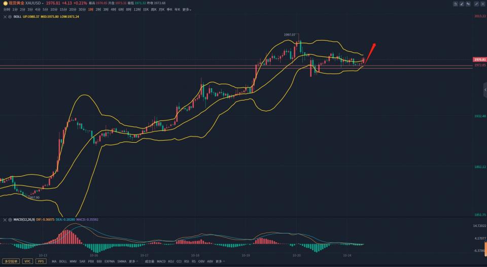 从日线上看,布林带开口,价格走出来了五连阳格局,整体走势偏多,从目前走势来看,价格高位震荡于上轨附近,早间开盘价格持续走高,并有走出新高的迹象,短线来说目前暂时不适合做空。4小时,布林带收口,有走平迹象,昨日价格冲高后小幅回落,但仍处于上行通道之中,下方中轨附近支撑较为强劲,日内操作继续回调做多即可,短线关注下方1970-1972一线支撑。