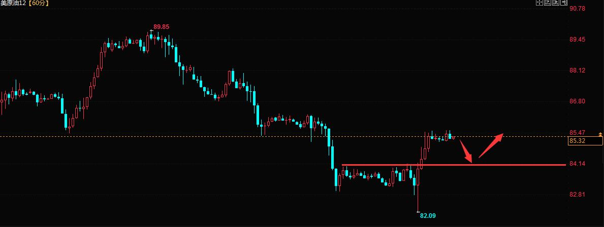 原油周三走了探底回升,整个白天围绕84.00下方震荡,美盘后走出了新低82.00,虽后探底回升强势上涨最高到达85.5。原油今天看低多,下方关注84.6、84.00看多。
