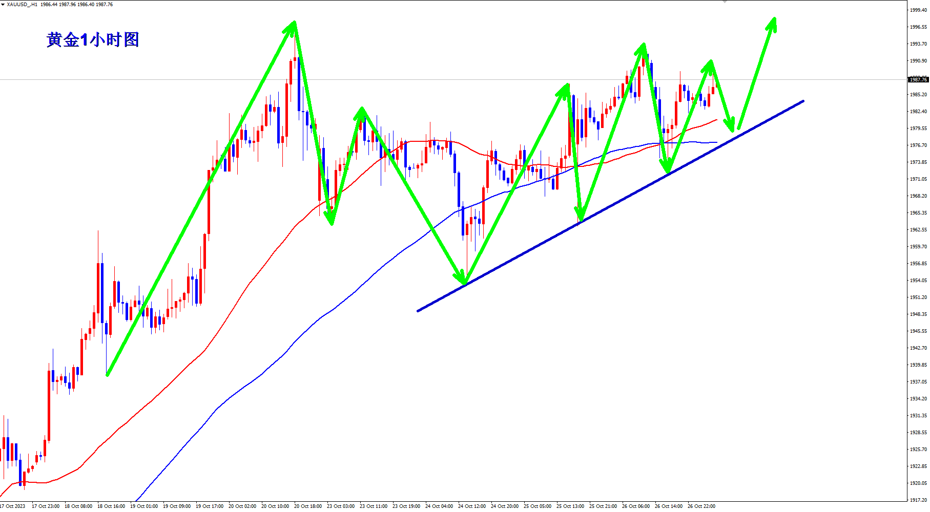 黄金跌不下去,多头力度还是很强,我们就先将多头干到底,顺势而为,趋势为王,不是一句空话,更要知行合一,才是制胜之道。市场都有自己的节奏,我们只能跟随市场节奏旋律一起舞动,这样舞步才会优美,如果你还在舞池中混乱不堪,那可以先找个教练一起陪练。今天周五了,我们能否一起见证黄金突破2000。