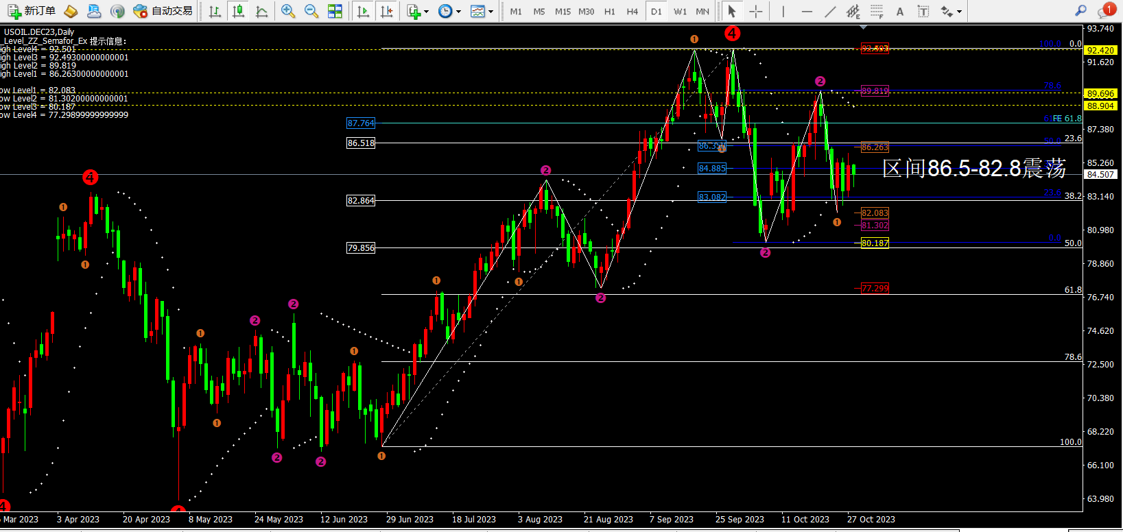 日线当前指标macd死叉,灵动指标sto双线粘合,代表日线震荡偏弱。但是日线蜡烛图的低点和高点不断升高,所以短期区间86.3-82震荡;而小区间是83-86区间。