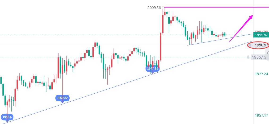 黄金周一整体走回撤,低点1990,虽然有回撤,但是没有延续度,现在的大趋势还是一个整体向上。从盘面上来看下方趋势支撑位处于1990附近,今日的走势并未有回踩的趋势,上周五的大阳在周一回修后可以说是已经修复完,现在操作还是顺势去多,上方阻力可参考上周尾盘高点2009位置,本周若破位2009去到2017附近,那么可以开始着手布局中长线空单了。短线操作上还是保持1990-2009区间高空低多即可。