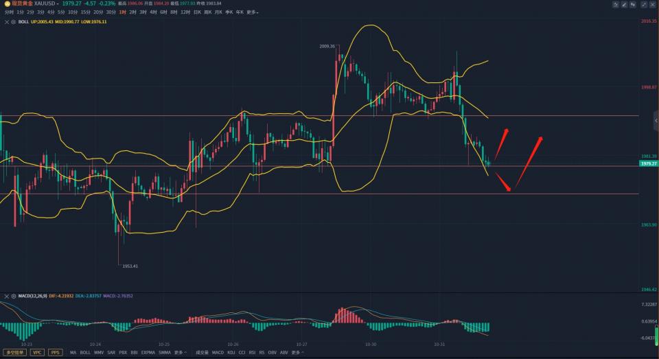 日线级别,布林带有收口迹象,价格连续两日回撤使得最近的涨势受到了一定遏制,价格在高位受到了压力,两次突破2000美元后均快速回吐涨幅,想要打开上方的房间,可能需要一定时间,虽然价格滞涨,但目前来看还不是做空的时候,短线操作上尽量还是等回调做多。4小时,布林带走平,价格在触及上轨后回撤,并顺势跌破中轨一线支撑,短线价格走势偏弱,不过目前价格处于支撑位置,想操作的这会可以考虑去做个多单博一下,止损不用太大,稳健的可以等等1970-1972这个位置再去做多。