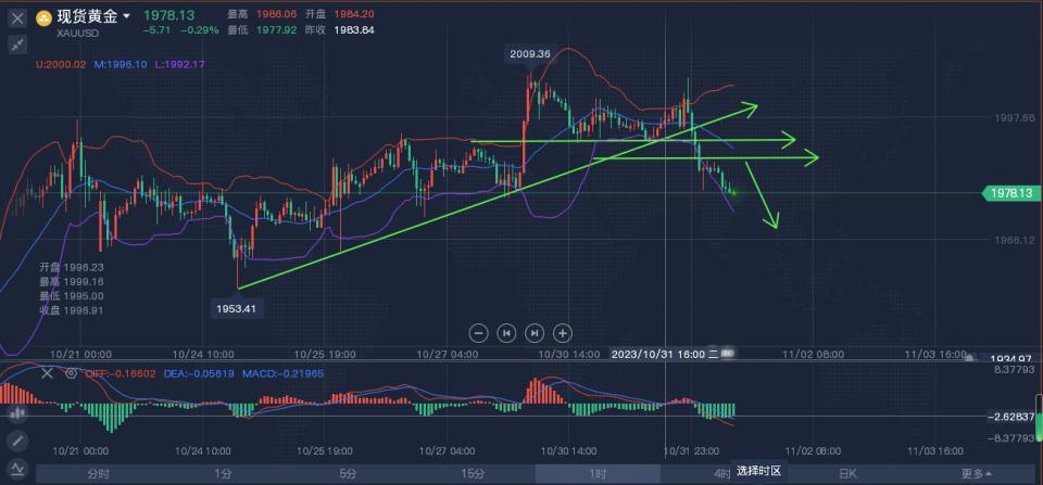 黄金方面、上周五日线大阳上升,昨日小阴调整,日线连阳单阴调整,昨日一定循环看多,昨日如期回撤双底企稳,晚盘2003周一晚盘高点,有延续走强的可能,但昨日晚盘没有破高,如果延续走强继续测试前高,那么美盘二次回踩低点1994一定不能破,否则虚晃一枪二次反抽见顶可能性就比较大,多单就需要调仓反抽去空。昨日晚间形成连续回落,跌破上升趋势线支撑以及1990附近双底,短线转弱并有见顶的可能,今日操作思路高空为主。