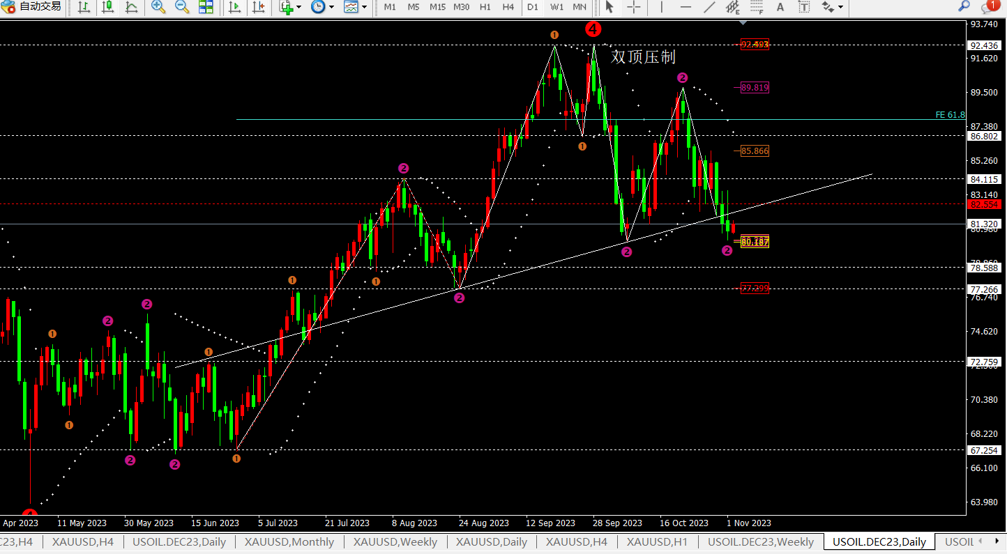 ① 日线指标macd依旧死叉放量运行,灵动指标sto勾头向下进入超卖区,代表日线还是低位震荡。那么前两日的高点83.3-4就是当前压制。目前均线MA5依旧是下移压制在82.2一线,日内空单需要在均线MA5上下0.3美金左右,笔者认为82.5-7附近是最佳位置。
