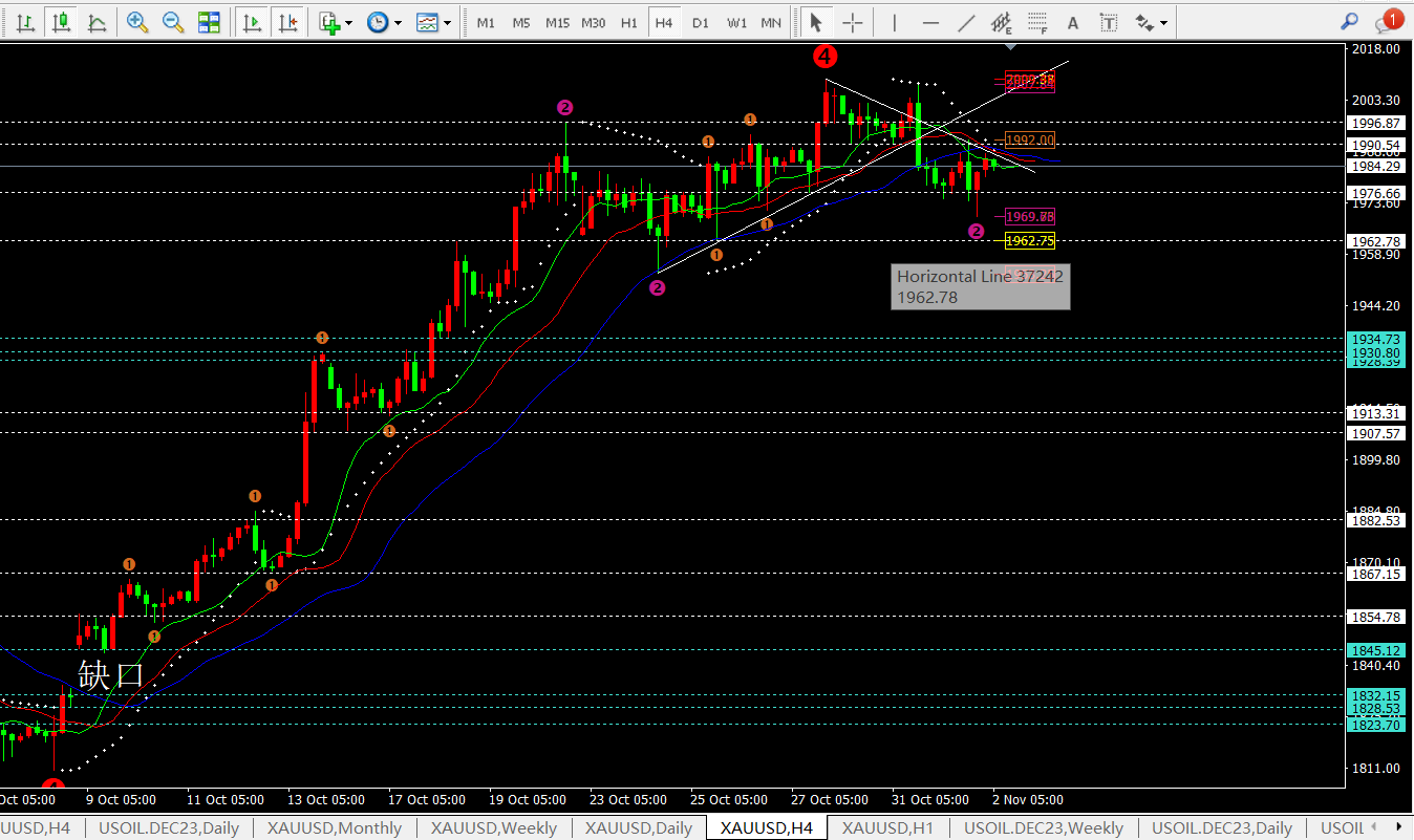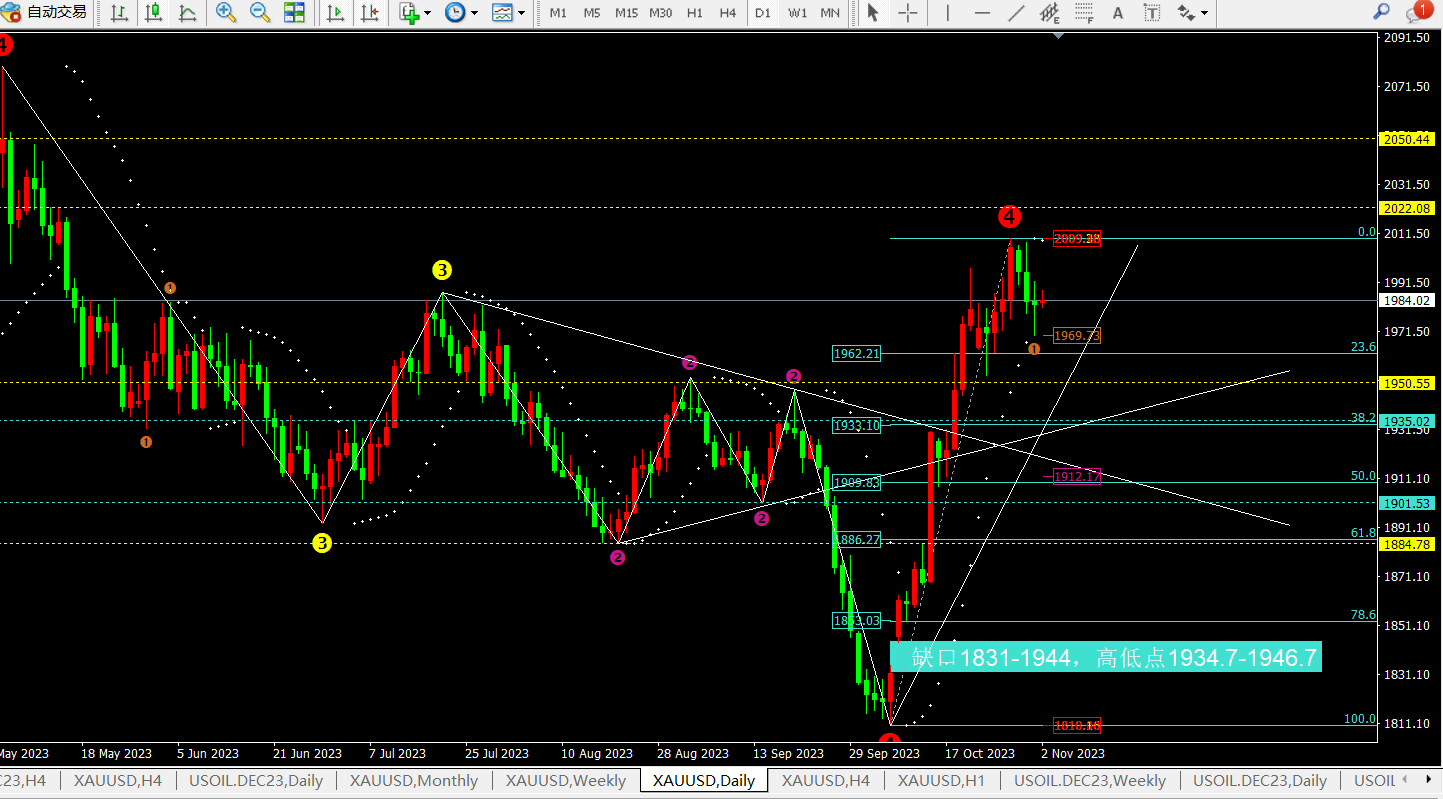 昨日黄金开盘从1986一线震荡下跌至1975后开启反弹并在美盘冲高至1992一线;我们1976-77多单是完美获利;而之后价格从1992一线开始震荡下跌1974附近,之后因为数据和讲话原因价格下跌至1969.7一线快速反弹拉升至1982一线,并在早间上涨至1988一线。因为数据的原因我们昨晚1990的空单在1984附近就直接走了,相对少赚了一些利润。