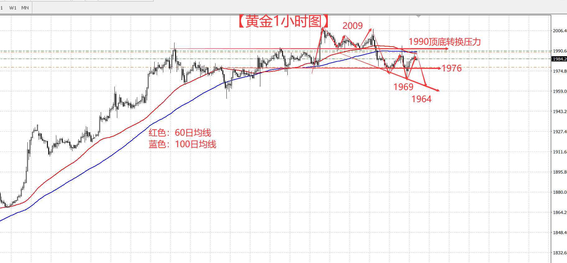 技术面来看,1小时结构,黄金先测试1978,利率决议前反弹测试1990的顶底转换,虽然有所刺破,但最终收线还是在1990下方,随后继续维持调整,隔夜测试1969地点之后反弹拉升,已经测试到1小时结构60日均线压力,再次承压,而且60日均线下穿100日均线形成死叉,今天还是继续关注1976-1990这两个点。