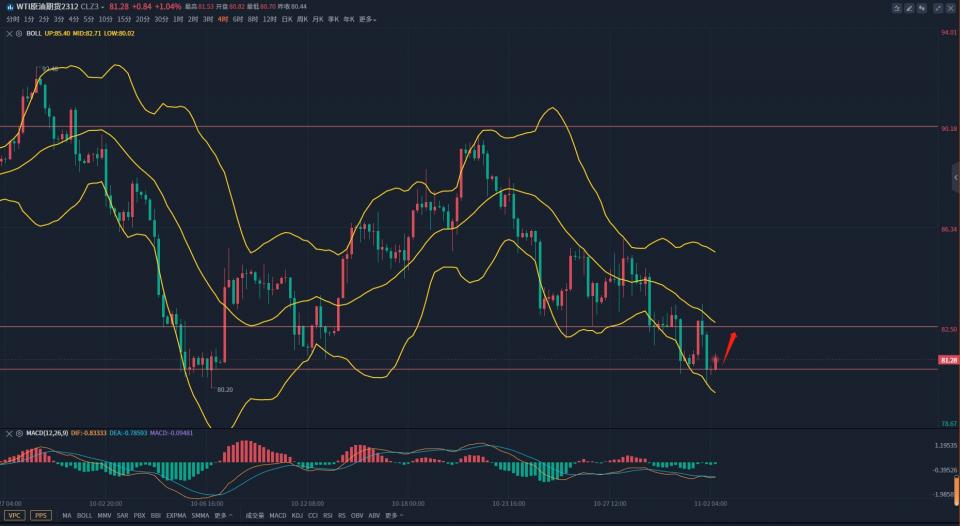 日线级别来看,布林带开口向下,价格在中轨的压制下震荡下行,连续三日的下跌使得价格再度回到月初低点附近,短线来看这个位置对于原油价格来说有一定的支撑,油价在此位置或将走出一波反弹行情。4小时,布林带开口,价格在下轨附近暂时企稳,昨晚的下跌并未跌破前期的低点,日内短线暂时先看一波反弹,下方关注80.9-80.7区域支撑,价格回撤后可在此尝试多一次。