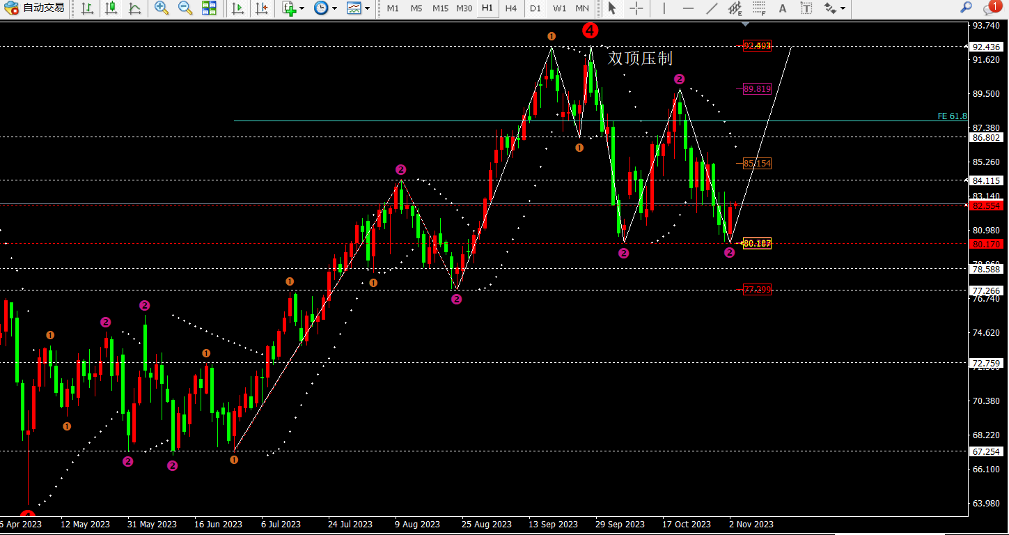 ② 4小时昨日大阳拉升之后,连续出现两根小阴柱;而当前4小时指标MACD金叉放量运行,灵动指标STO快速向上修复,说明短期4小时得先冲高,然后才能回落。当前下方支撑在均线MA5和中轨附近对应82.3和81.8附近。而上方压制位于上轨和均线MA60附近对应83.3-84一线。