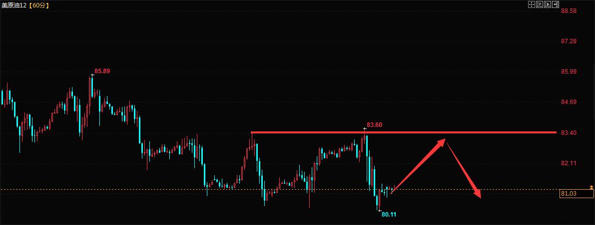 原油方面,上周从85.00跌到81.00一线,而80.00是周线和月线的关键支撑位,从形态来看,未来的几个交易日震荡概率很大,思路以高空为主,上方关注83.00-83.70附近可分批看空。