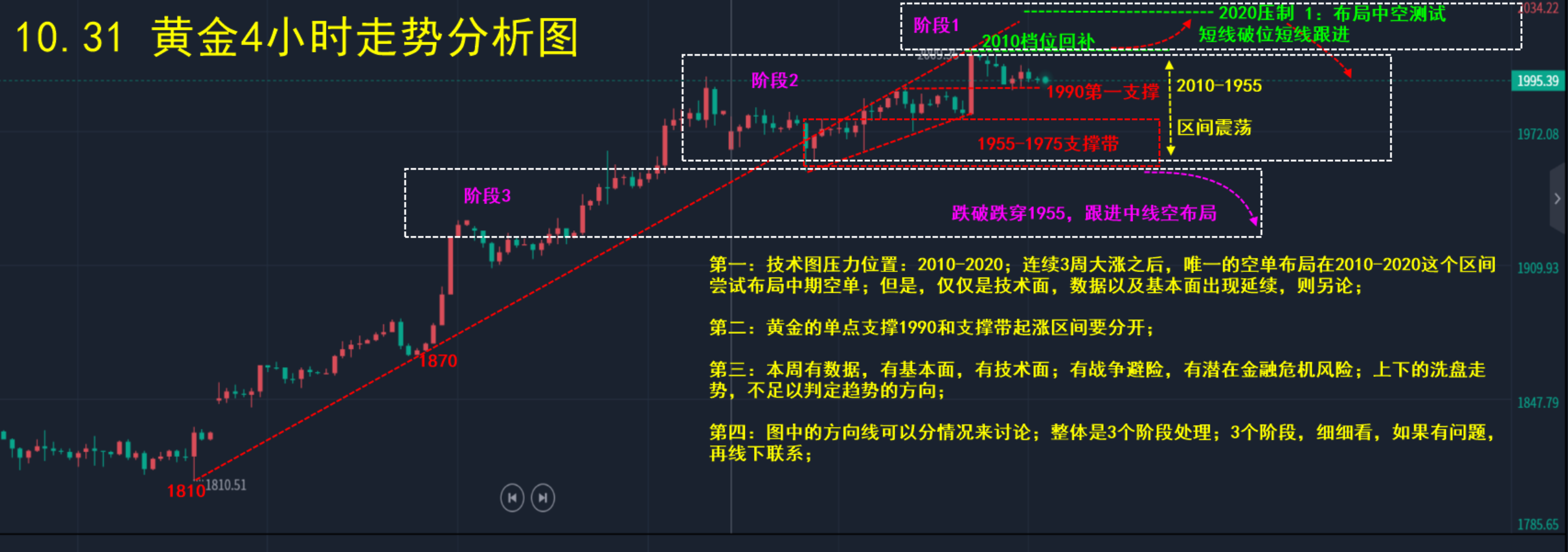 4:日内亚盘给出的1977附近空,暂时边做持仓,边去博弈下跌;此外,1975上下的位置还可以持续沽空看跌;下方强支撑位置1955-1950这里的支撑位置!