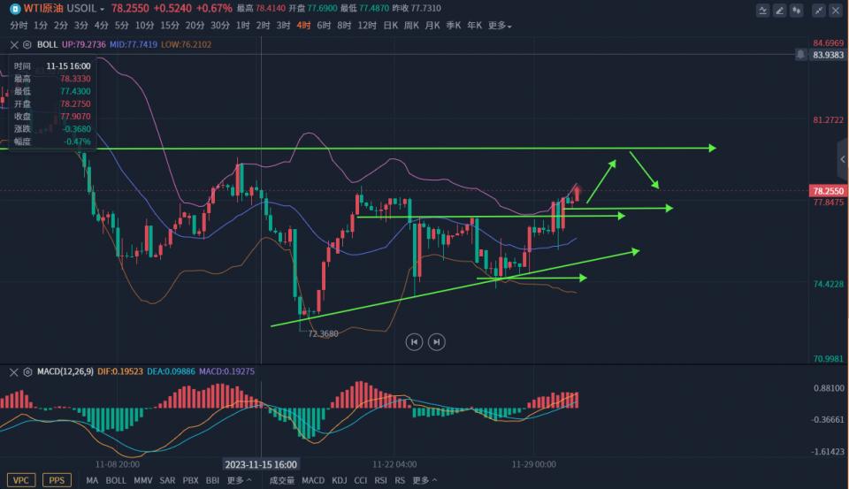 原油:77.5附近多,损76.6,目标79.4-5,79.6附近空,80加空,损80.7,目标78附近