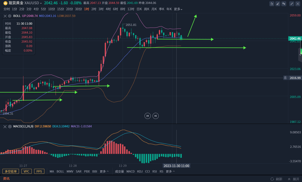 昨日日线高位十字星调整,前面大阳上升,十字星调整,今日还需继续看多,凌晨冲高,早盘回落调整,今日继续看多就不能期待太大幅度的回撤,凌晨和早间回踩的低点2042附近直接去多。分水岭昨日低点2036,昨日已经出现调整低点,就不能再次去破低,否则深度回撤。历史高点近在咫尺,个人认为大概率会破新高洗盘,回踩就是多的机会,没有破新高测试爆发市场多头情绪之前暂时规避空单,破高就是中空机会,因为价格偏离均线较远,日线和周线背离信号非常明显。