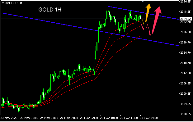 黄金短线(1H)走势高位盘整次要调整,从形态看金价在均线系统依托下,形成三角形或旗形中继形态雏形,短线主客观趋势一致向上,预计日内黄金将继续突破前高创下新高点的概率较大。