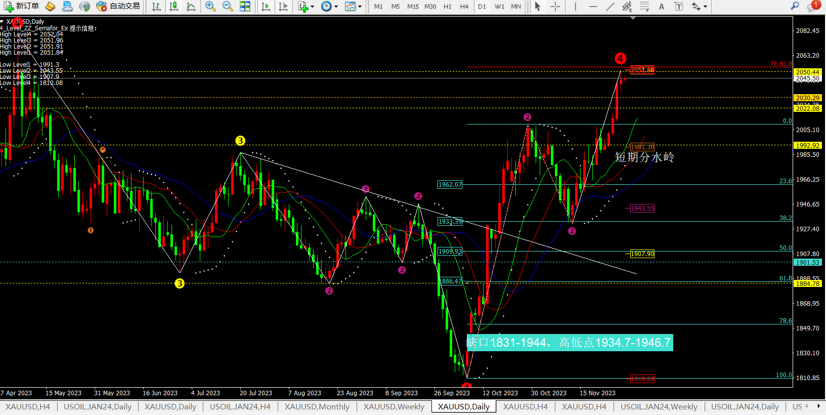 综合①②③点天成认为今日震荡的几率比较大;反转因为日线当前属于单边所以不可能;加速因为目前4小时和小时回落概率减弱,所以震荡几率增加。那么2052-2030这个区间可能就是今日的做单点。