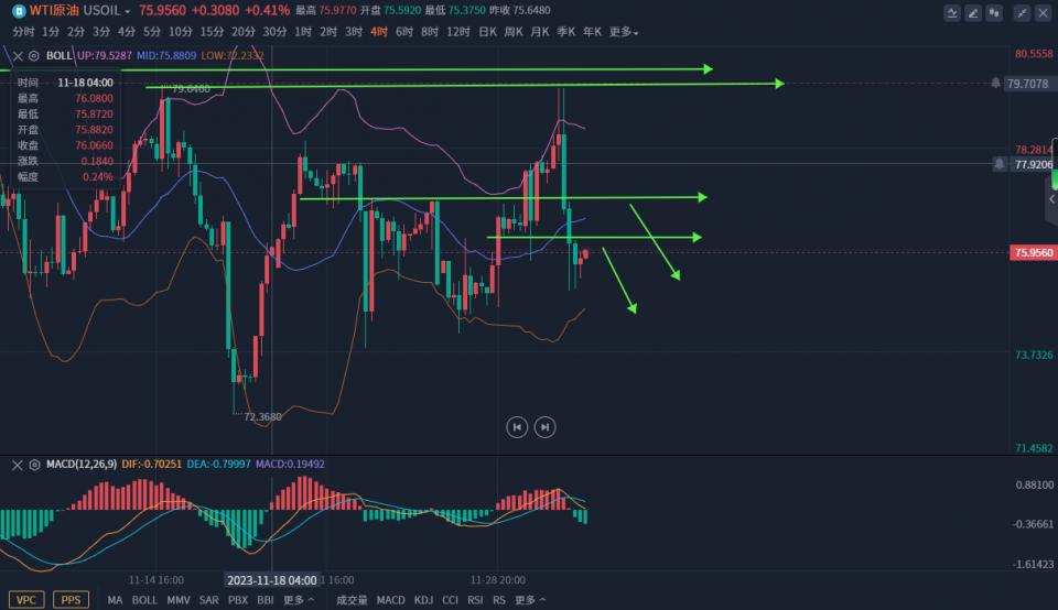 原油:76.2-3空,77加空,损77.3,目标74附近