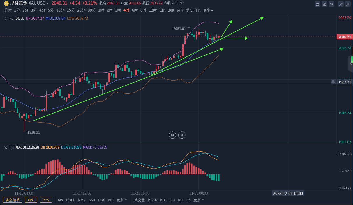 回踩的幅度越小,上升力度越强,同样上升时间越早,晚盘形成延续的可能性就越大。已经经过几天盘整,周五和周一一般容易走出极端延续性行情,价格没有破历史新高或没有构建明显顶部结构,暂时不要考虑空。日线和周线技术指标背离,美联储利率仍处于高位,要等市场多头情绪彻底爆发将迎来中线空机会。