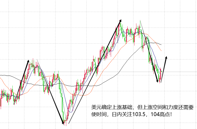 美元周四按照预期的持续走强,一波力度最高上涨至103.5,从盘面很容易看出,前期的空头极弱转为多头极强,虽然午夜盘没有持续,但上涨的基础已经出现,后市就等市场持续的放量空间,下一波上涨将继续看103.5,104高点,具体大涨则需要看12月非农数据的影响,这波多头的确定性空间可以看到105.8之上。因此,近期市场托到12月非农前后一定是看涨美元,看跌黄金,大家需要耐心等待市场变化。