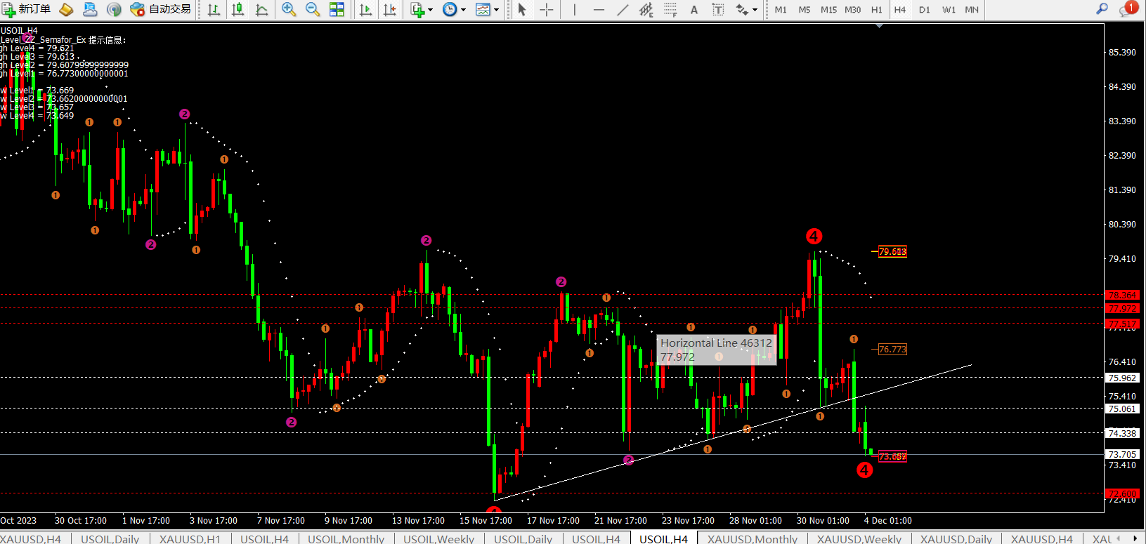 日线当前macd金叉缩量粘合震荡,灵动指标sto快速向下修复,短期日线逐渐触及下轨附近支撑。关注下轨和抛物转向点的支撑的破位情况对应73.3和72.6附近。