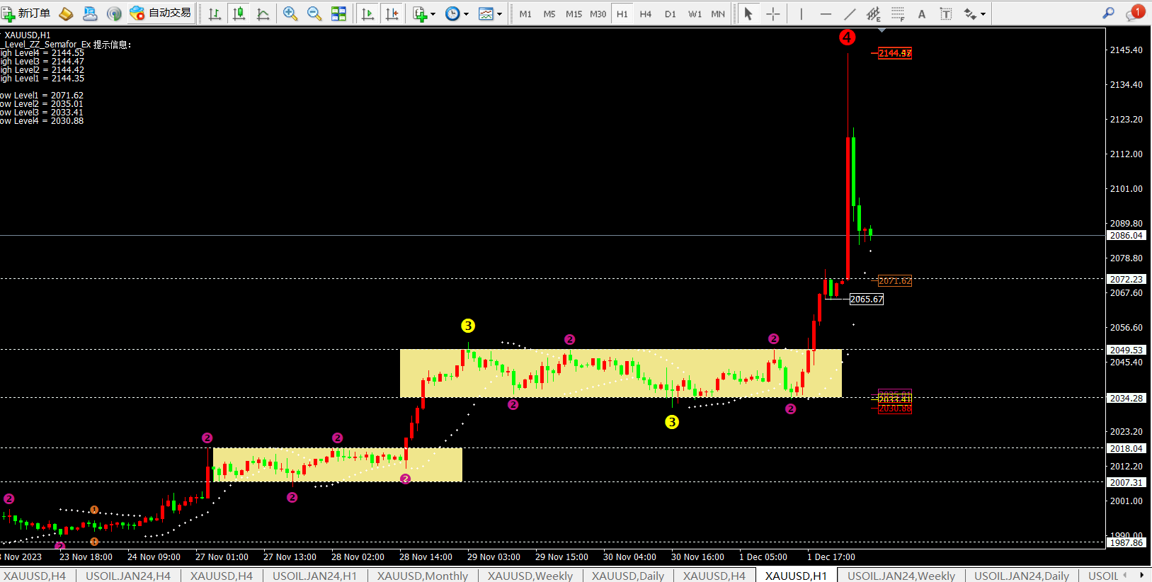 黄金周一开盘价格在2077-2071震荡15分钟后,随着大量黄金期货合约空头的抛售,价格快速上涨日内高点2144一线,之后价格再次回落至2109后反弹至2135附近开启震荡回落至2083一线。