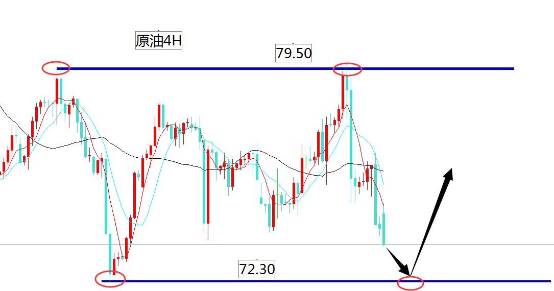 周五我们布局了76.40的原油空单,目前看爽歪歪,原油大小趋势比较纠结,大周线的趋势比较明显是空头,但是短线的形态是底部大震荡,而且幅度很大,今天的原油看跌不追空了,看看上面的形态图吧,72.30是之前的低点,有再次弹起来的需要,今天的原油空是反弹高空对待,大压力是空的机会。