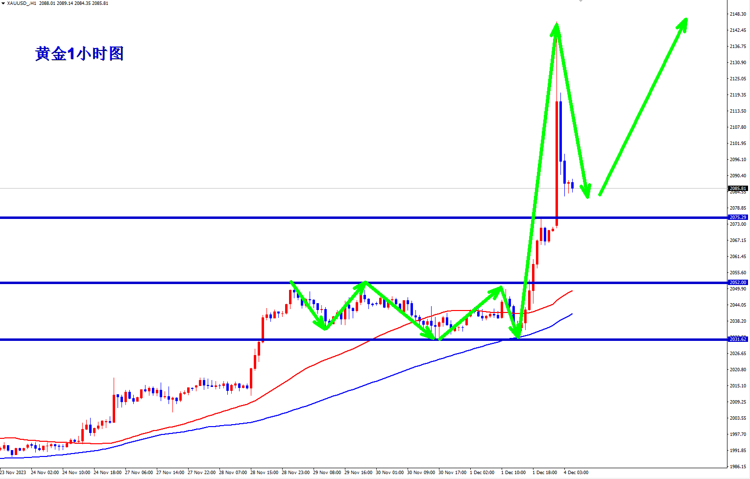 黄金1小时均线还是继续多头向上,还是多头排列,多头还远远没有结束,黄金现在前面历史高点2075-2080区域都是支撑,回落就是继续给干多的机会,多头趋势没有改变,回落就是给我们干多的机会,黄金现价2085可以先多起来。