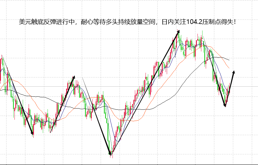 虽然暂时美元和黄金走势脱钩,但美联储的政策性和市场环境还是会在主体上影响美元,从而影响贵金属的宏观走势,所以,只要在资本市场中游走,一定要密切关注美元的涨跌。周一美元按照山海预期的状态走出慢涨空间,最高在103.8附近,走势非常正常,底部结构也愈加牢固,周二的变化预计也不会很大,继续看上涨状态,上方关注104.2得失。在此环境下,黄金依旧是被打压的状态,下方有较大空间可看。