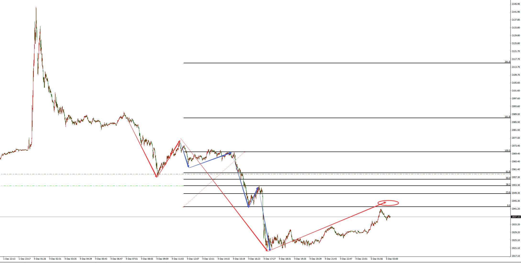 12月5日星期二,昨天早上我们提出2034多单全部在2143附近果断全部出局。并提出如果2144是黄金从1930上涨的这轮顶部,那么黄金将会从2144下跌到2010附近。我们这一论断也得到了行情完美演绎。在昨天早上黄金上涨到2144位置,当时我们也是真不知道黄金最终会涨到何处,黄金这波上涨行情起步于1930位置,我们的心理预期看涨目标在2130附近。黄金已经远远超过了2130这个预期目标位。因此提出多单全部2143果断出局,落袋为安。第二我们也根据经验判断看,这种暴涨行情,如果见顶,那么会迅速暴跌,行情虽然波动大,但是风险也巨大。因此多单2143离场后,就绝对不可以再追多。作为稳健派分析者,我们是风险厌恶者。因此当我们2034多单在2143出局后,就提出观望为主,等行情平稳后再进行分析。昨晚黄金最低下跌到了2020位置。今天黄金则怎么看,以下是我们的独家分析。