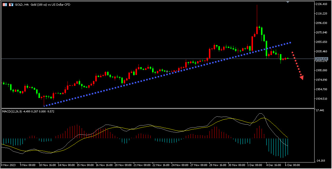 周二(12月5日),在美元吸引力不断上升的情况下,黄金连续两天暴跌,违背了传统的避险地位。昨日回踩4小时上升趋势线突破以后形成的压力位后继续下跌,今日关注黄金回调力度,出现企稳信号后继续做空黄金。