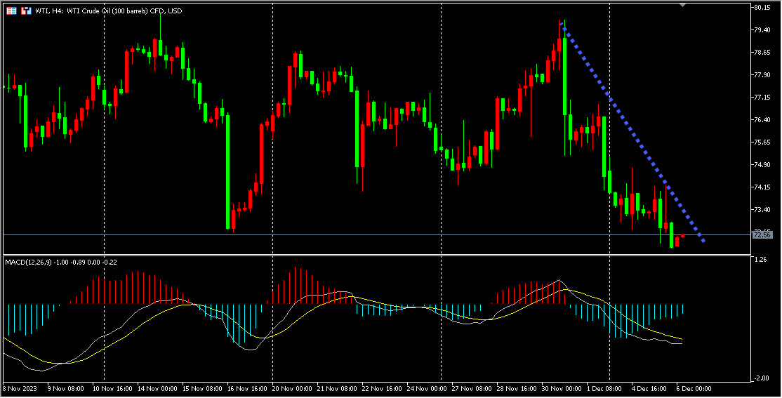 周二(12月5日),OPEC+会议尘埃落定后,WTI石油价格冲高回落,跌破前期低点支撑位,这是自7月6日以来两个原油基准的最低收盘价,对于WTI来说,这是自5月份以来首次连续四天下跌。这一情况归因于美国石油出口接近历史高位,国内原油产量创下历史新高,掩盖了沙特阿拉伯关于OPEC+将兑现减产计划的承诺。今日原油继续关注4小时下跌趋势线压力位,出现企稳信号后做空。