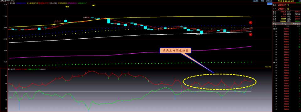 通过对黄金小时图解析得知,黄金从早盘到目前为止在下方布林带中轨的位置得到有效支撑,目前已经到大上方双轨的压力位(2号位)相对而言也是有一定的压制作用的,我们从下方的附图来看短期多头主力依然是处于高度控盘的状态依然是大于空头主力的持仓量,短期就看上方双轨的压力能不能有效的放量突破,我们敬请关注盘中行情变化,短期在操作上我们继续高空低多思路,重点逢低做多,具体建议参考早盘策略