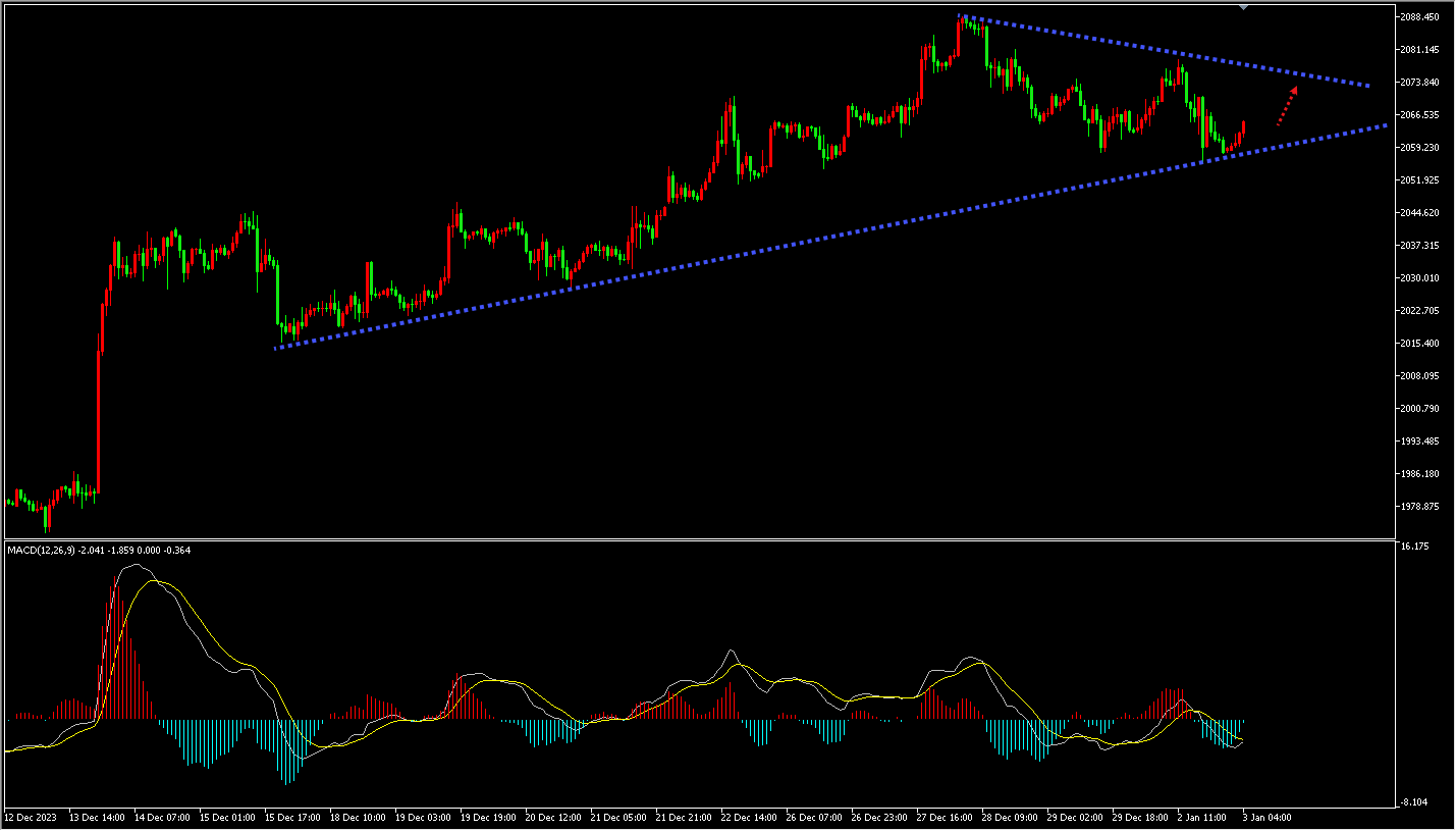 周二(1月2日),随着宏观经济数据不温不火,股市和政府债券小幅走低,国债收益率上升支撑美元上涨,创去年3月以来的最大单日涨幅。在美国采购经理人指数 (PMI) 数据低于预期后,股市和大宗商品下跌,现货黄金出价上涨后回落至近期中位价。今日继续关注1小时上升趋势线支撑位,回调企稳后做多,同时上方关注1小时下跌趋势线压力区域,
