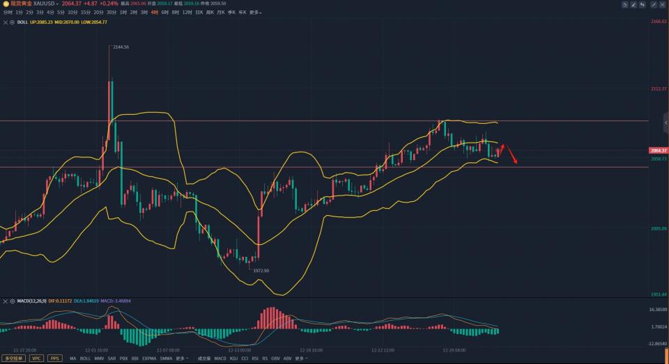从日线看涨势缓慢出现回调信号,昨日价格冲高回落,短线上方存在阻力压制,4小时,价格呈高位横盘走势,价格跌破中轨后承压于中轨下方,短线价格大概率还会有下探的机会,不过空间并不是很大,日内短线关注上方2068一线阻力,操作上暂时先看回撤。