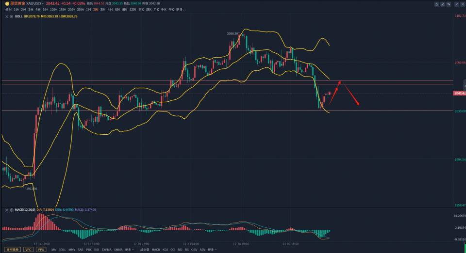从日线级别来看,布林带有收口迹象,价格自上轨附近持续回撤,不过昨日短暂刺穿中轨支撑后还是守在了中轨上方,预期日内价格或将有所反弹,但反弹的空间并不会太大,在价格强势上涨之前,大概率会有二次探底的机会。4小时,布林带开口向下,价格依托布林中轨一线阻力后持续下跌,目前价格暂时在2030一线企稳,早间开盘价格持续反弹,并有继续走高的迹象,日内需重点关注上方2050-2052一线阻力,预期价格小幅反弹后还会延续下跌走势,操作上以反弹做空为主。