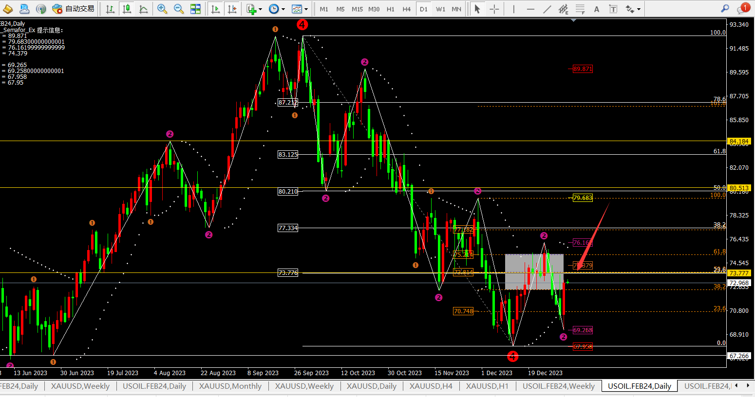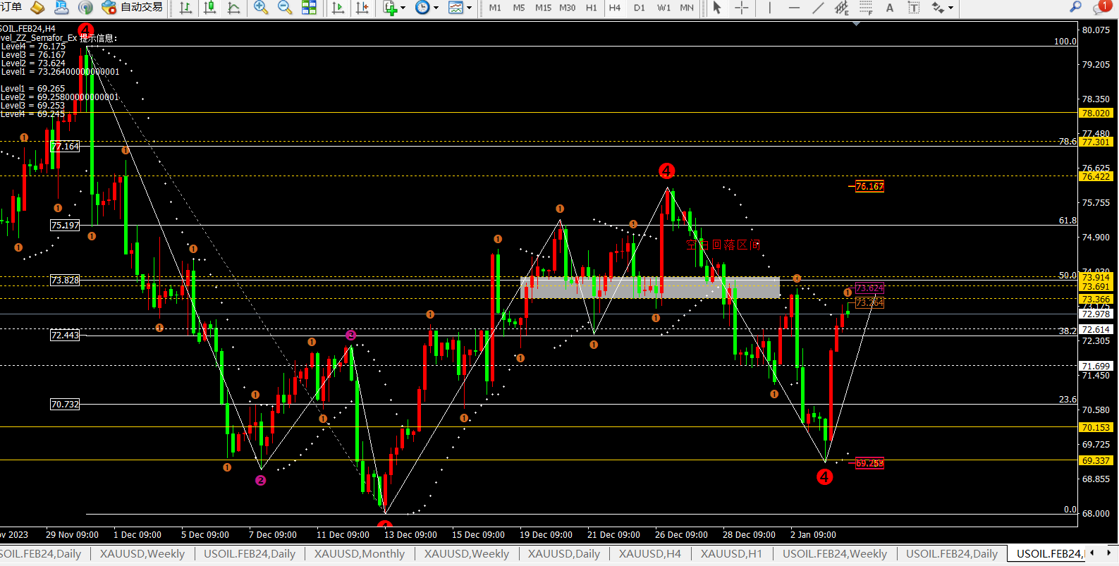③ 4小时当前macd金叉放量运行,灵动指标sto的快线出现折线下压,代表价格有回撤的迹象。目前就关注均线MA60放平压制73.35一线,不能站稳价格高位震荡后回落。