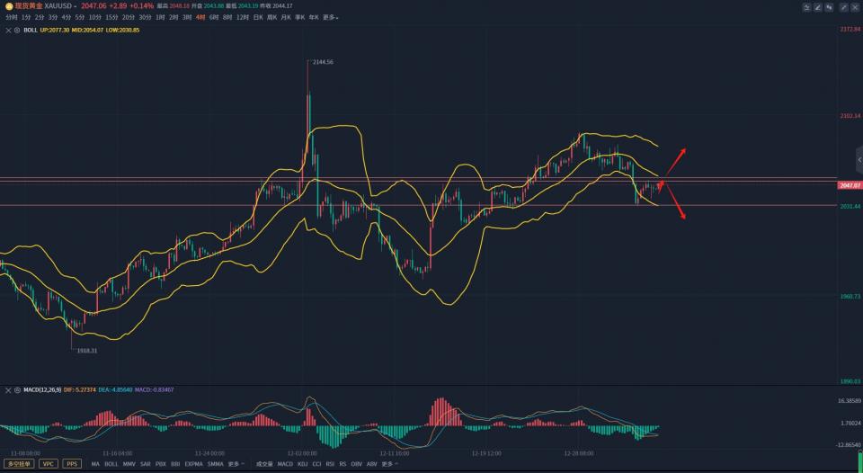 从日线上来看,布林带收口,有走平迹象,昨日价格的冲高回落,最终还是站在中轨的支撑上方,那么短期黄金价格是涨是跌就要重点关注布林中轨附近支撑的得失,也就是2036一线。4小时,布林带持续开口向下,价格承压于中轨阻力横盘震荡,这也是为什么大方向看涨的情况下,昨日给了去做一波回撤行情的原因,日内预期价格或将维持在中轨下方运行,短线上方继续关注2050-2052这个区域的阻力,目前暂时保持观望态度,数据公布之前行情波动不大,单子进场空间没有多少,耐心等待数据公布之后再去跟随吧。