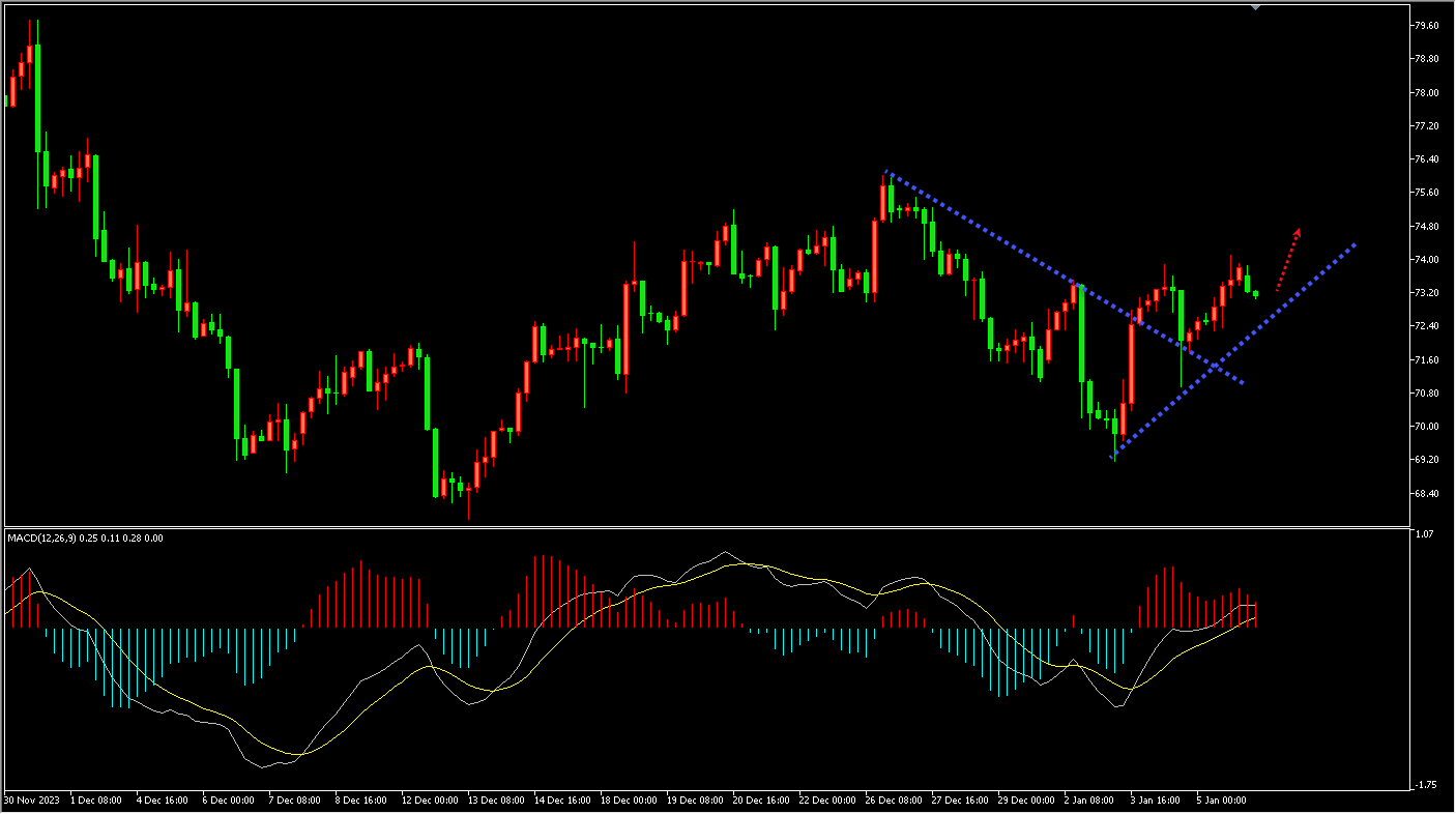 原油上周五按照预期受到中东局势紧张、原油供应和需求的变化以及美联储货币政策的影响是当前原油市场的关键因素在4小时下跌趋势线形成的支撑位附近企稳后开始拉升,今日原油关注4小时短期上升趋势线形成的支撑位,出现企稳信号后做多原油。