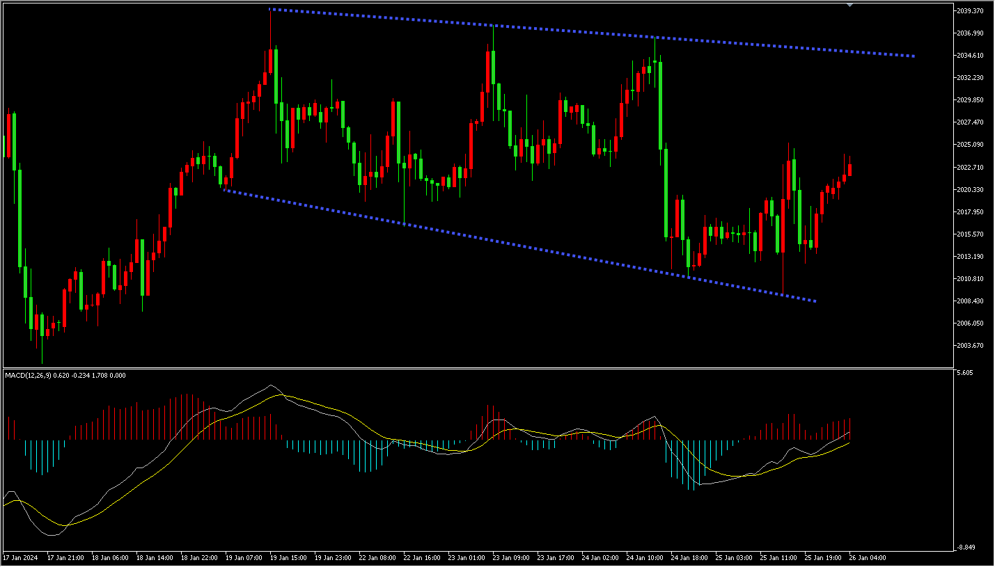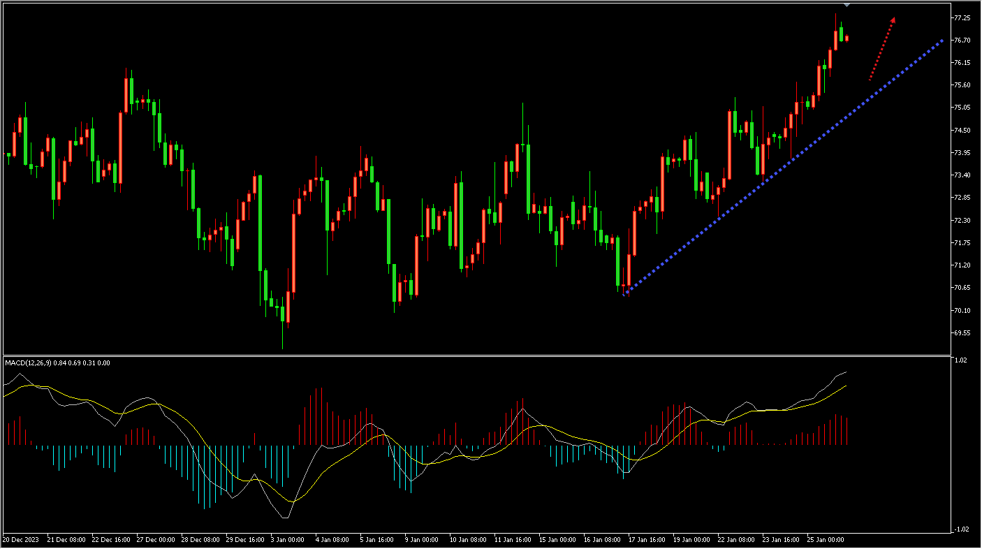 周四(1月25日),原油市场略微回调以后受到美国经济数据和红海紧张局势的影响。美国第四季度经济增长超过预期,给市场带来了乐观情绪,同时,红海紧张局势导致全球贸易扰乱,油价展开上行,今日继续关注原油4小时趋势线支撑区域表现。