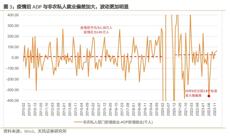 且两者出现大幅偏差的情况也更加常见,比如2023年6月,ADP新增就业为54.3万人,而同期非农私人部门新增就业仅有18.5万人,两者之间出现了1.8个标准差的大幅偏离。而疫情前的10年,超过1.8个标准差的偏离水平也仅出现过三次。