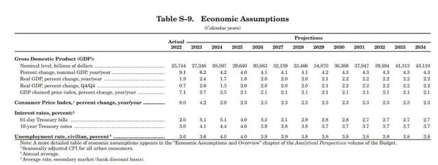 政府借贷成本方面,与白宫早些时候对2024年的预测相比,他们最新预计的借贷成本要高得多。一年前,他们预计2024年的三个月期美债平均利率为3.8%,10年期美债平均利率为3.6%,事实上证明这过于乐观了。白宫最新预计今年这两大利率的平均水平分别为5.1%和4.4%。