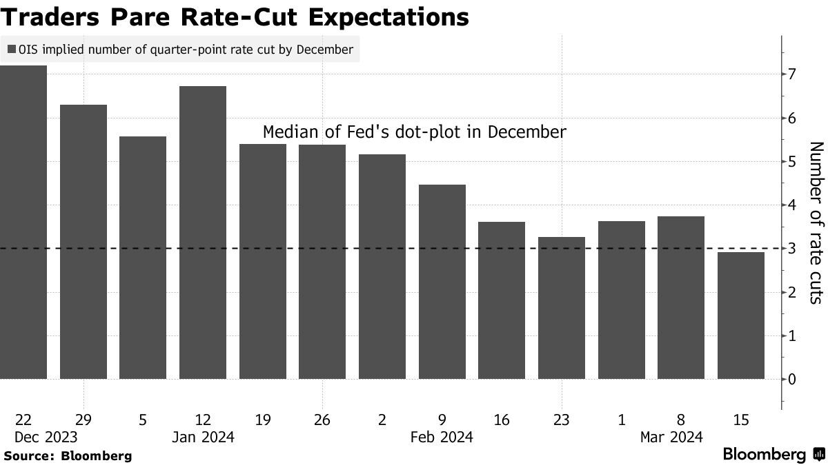 利率掉期目前反映出市场对今年降息25个基点不到三次的预期。这低于美联储去年12月的预测中值,也不及市场在2023年底预计的六次降息。对于首次降息,投资者甚至不再相信这种情况会在今年上半年发生。