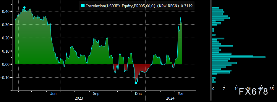 随着市场普遍预计日本央行将在两日会议后取消负利率政策,韩元和日元的货币走势更加一致。本月韩元对日元的60日相关指数达到0.35,创下自2023年5月以来的最高水平,显示两国货币同步移动。