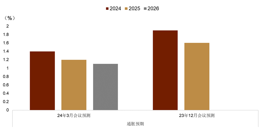 本次会议意外降息的原因我们认为主要有以下几点:1.SNB在会议声明中表示[2],“之所以能够放松货币政策,是因为过去两年半的抗通胀之战卓有成效(图表1)。” 2.瑞士央行下调对通胀的预期。本次会议上SNB大幅下调了其对通胀的预测,将今年通胀的预测从去年12月会议上的1.9%下调至1.6%,而对未来几年的通胀预测都下降至其通胀目标上限2%之下(图表2)。正如SNB行长所解释[3],“根据SNB最新的预测,瑞士通胀可能会在未来几年之内都维持在这个目标区间内。”3.SNB小幅上调了其对今年GDP的预测至1%(上次会议上预测GDP增速为0.5%-1%)并在会议声明中表示[4],“海外经济活动的减弱可能构成经济下行风险的主要来源而降息可能会刺激瑞士国内经济增长并且对瑞士出口提供支持。”至此我们认为,SNB本次会议上选择降息也是为了支持本国的出口进而避免海外经济潜在的下行风险。4.提前避免瑞郎走强。我们认为,考虑到美联储和欧央行大概率将会在6月开始降息,而SNB的下次会议将在美联储和欧央行之后进行,为了避免瑞郎在未来3个月内由于市场对美联储和欧央行降息的预期逐步升温,进而带动瑞郎升值也是SNB最终决定提前降息的重要原因。