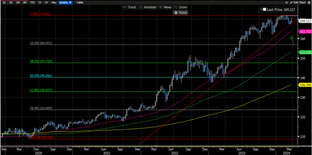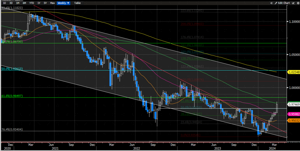 瑞郎/日元今年年初已经涨至历史新高172下方附近但目前看并未成功向上突破,我们认为如果瑞郎多头无法在近期继续走高并且突破这一关键的阻力,尤其如果跌破了2023年以来的上升趋势线支撑,那么瑞郎/日元回撤的风险将会大增,50周均线164附近可能成为近期第一个关键支撑(图表4)。而欧元/瑞郎自今年以来连续走高目前已经涨至关键的100周均线0.9775附近,短期看如果欧元多头可以继续收复这一关键阻力位置,那么欧元多头的下一个目标可能位于61.8%斐波那契回撤位0.98附近,但在此之前我们依旧需小心欧元多头在关键的100周均线附近获利了结带来的欧元/瑞郎回撤风险(图表5)。