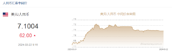 3月22日,人民币中间价报7.1004,下调62点,上一交易日中间价报7.0942。