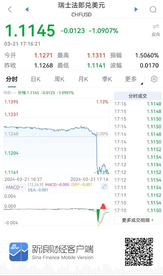 2024年3月21日,瑞士央行意外降息,瑞士法郎兑美元下挫1%。