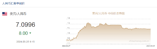 3月25日,人民币中间价报7.0996,上调8点,上一交易日中间价报7.1004。