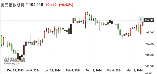 3月21日,美联储维持利率不变,但“点阵图”出人意料,即使年初通胀数据超预期,但仍支持今年3次降息各25个基点,释放出鸽派信号。这导致美元指数强势攀升,收于104大关之上,报104.115。